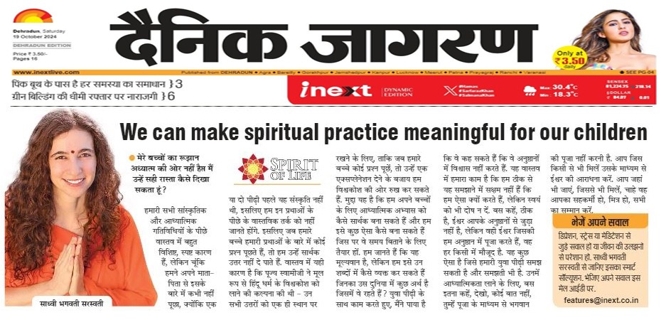 "Teach children to believe in the goodness of people," Sadhviji encourages us in the newest Spirit of Life column in Dainik Jagran's Inextlive. "There are," she says, "so many things we teach our children – to be independent or reliant, compassionate or judgemental, giving or selfish. But,...
