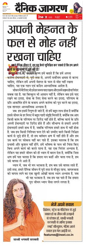Don't be attached to the outcome of your efforts, Sadhviji brilliantly shares in this week's Spirit of Life column in Dainik Jagran's Inextlive, saying ""Do your Dharma fully and completely, but without attachment to the results - that is the essence of true Detachment." अपने प्रयासों...