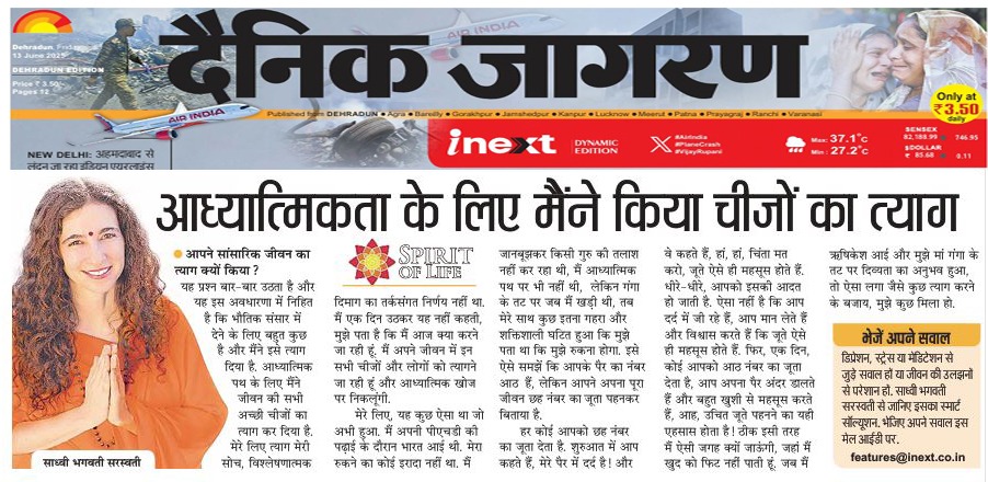 "For spirituality," declares Sadhviji in this week's Spirit of Life column in Dainik Jagran's Inextlive, "I renounced many things." Read the article to find out what those things were. For more of Sadhviji's divine Drops of Wisdom, be sure to visit her LinkTree page at https://linktr.ee/sadhviji...