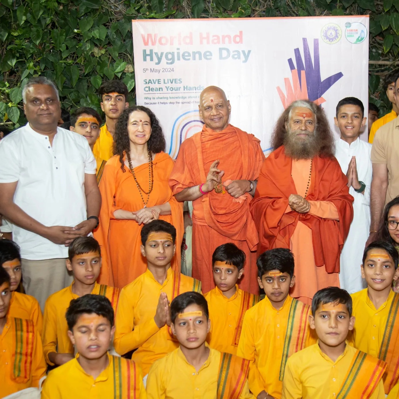 On World Hand Hygiene Day, Parmarth Niketan President, Pujya Swami Chidanand Saraswati Ji; Shri Ram Janmabhoomi Teerth Kshetra Trust Ayodhya Treasurer, Swami Govind Dev Giri Ji; and GIWA Secretary-General Sadhvi Bhagawati Saraswati Ji joined together with team members from the Global Interfaith WASH Alliance and the Harpic World Toilet College to explain to the Rishikumars of Parmarth Gurukul the importance of cleanliness and purity at the physical and spiritual levels as part of the global “Save Lives – Clean Your Hands” campaign.