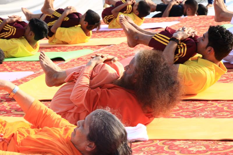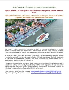 परमार्थ गंगा तट पर ‘‘अयं निजः परो वेति गणना लघुचेतसाम्। उदारचरितानां तु वसुधैव कुटुम्बकम्।’’ के दिव्य मंत्र के साथ योग प्रोटोकाॅल की शुरूआत हुई तथा राष्ट्रगान के साथ कार्यक्रम का समापन हुआ।