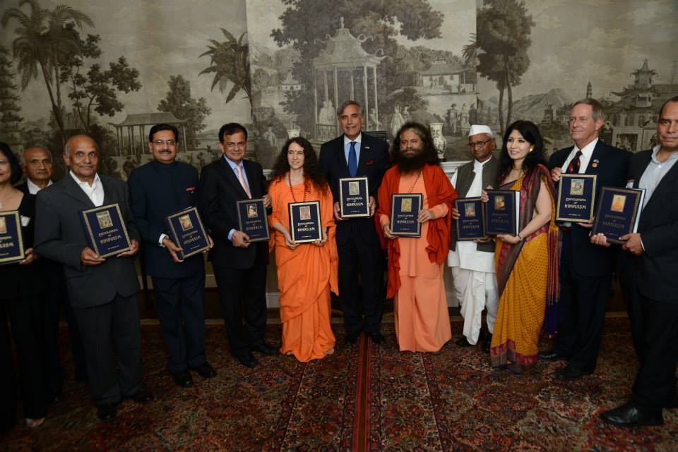 Pujya Swamiji presented the first official set to the Governor of the State of South Carolina, for the State’s Library. Hon’ble Nikki Haley, the Governor said: “It is so beautiful, and such a great gift, this Encyclopedia of Hinduism. I am so honored to receive these beautiful 11 volumes on behalf of the State. I am so glad to be here tonight at this historic event.”