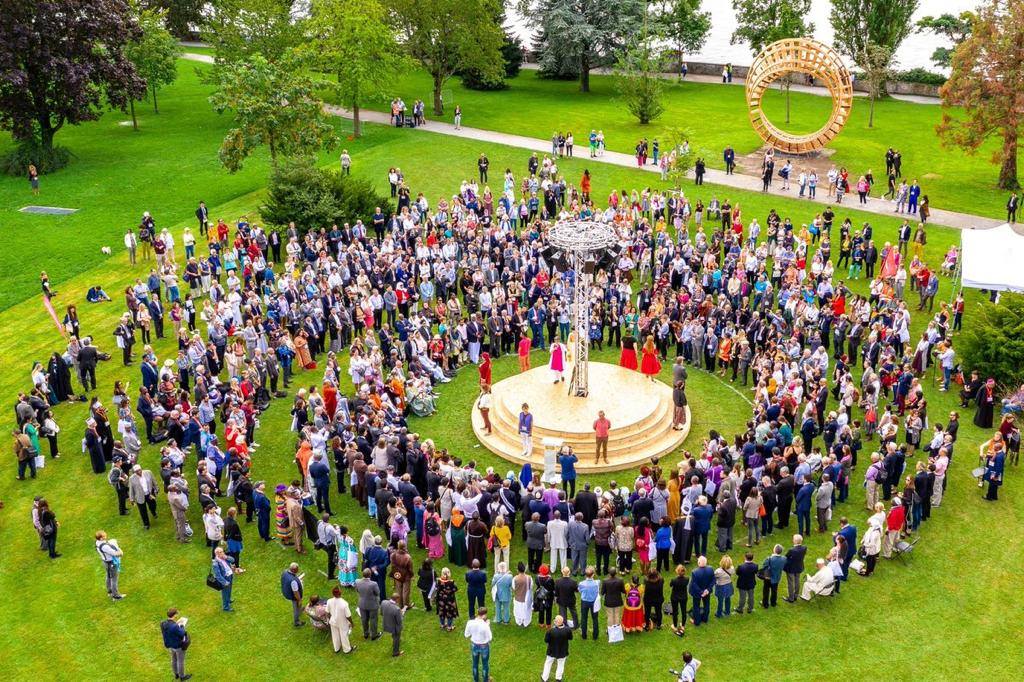 In a beautifully symbolic and evocative ceremony, the 1000 participants of the gathering walked and prayed together for peace, then formed a circle around a beautiful “Ring for Peace” sculpture, a 7.5 metre structure made of wood from different regions of the world that will find a permanent home in a park in Lindau on the shores of Lake Constance.