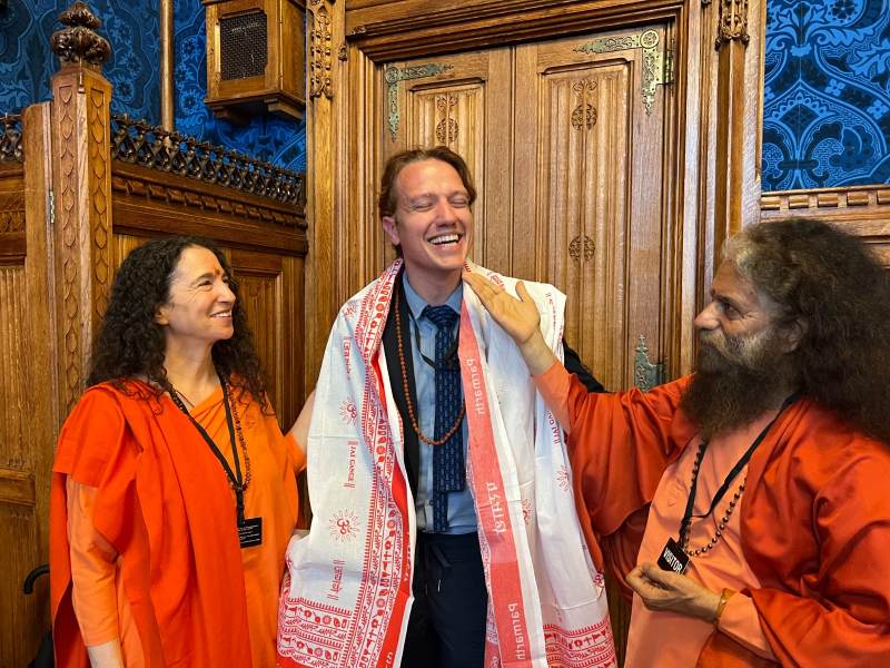 Sadhviji presented Lord Layard and Alex each with a copy of Sadhviji’s book Hollywood to the Himalayas, and shared with them how she found her true happiness on the beautiful banks of Mother Ganga.