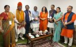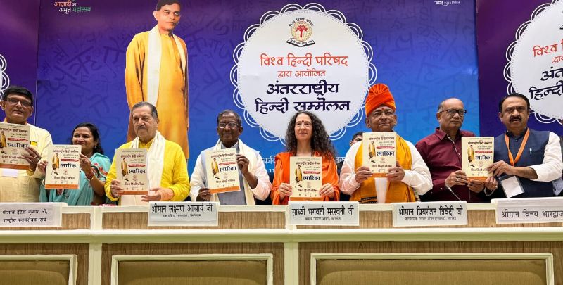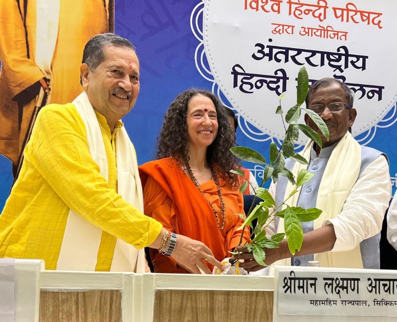 After returning home to India from her months-long travels abroad, Pujya Sadhvi Bhagwati Saraswatiji of Parmarth Niketan joined numerous distinguised lumninaries in New Delhi for the International Hindi Conference organized by Vishwa Hindi Parishad at Vigyan Bhawan to celebrate the beautiful and timeless language of Hindi. Participating in the auspicious event were the Governor of Sikkim, His Excellency Shri Laxman Acharyaji; senior leader of Rashtriya Swayamsevak Sangh (RSS), the Honorable Indresh Kumarji; General Secretary and Convener Vishva Hindi Parishad, Dr. Bipin Kumar; Co-convenor Shri Deepak Thakurji and other special guests.